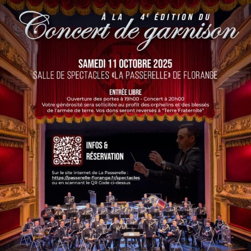 Le 40ᵉ Régiment de transmission, basé à Thionville et Hettange-Grande, organise la 4ᵉ édition de son Concert de Garnison le samedi 11 octobre à la salle de spectacles La Passerelle à Florange ! L’orchestre de l’Arme Blindée Cavalerie animera la soirée avec un répertoire varié. L’entrée est libre et ouverte à tous. Chaque don effectué contribuera directement à soutenir les orphelins et les blessés de l’Armée de Terre (Terre Fraternité). Alors, tous à La Passerelle de Florange le Samedi 11 octobre… Ouverture des portes à 19H • Concert à 20H